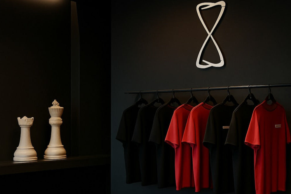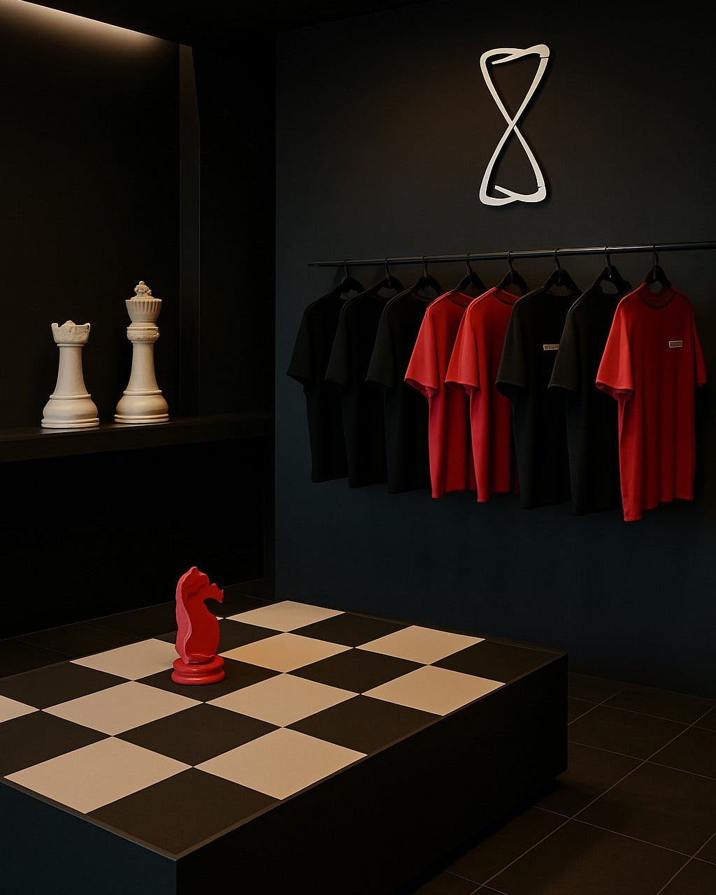 Zugzzwang stands at the intersection of luxury , brashness and dark humour. At heart lies a minimalist identity , enriched by bold , unexpected details. The brand's essence is symbolized by an hourglass symbol, featuring two inverted Zs that echo a chess timer, referring to the strategic patience inherent in both chess and fashion.
